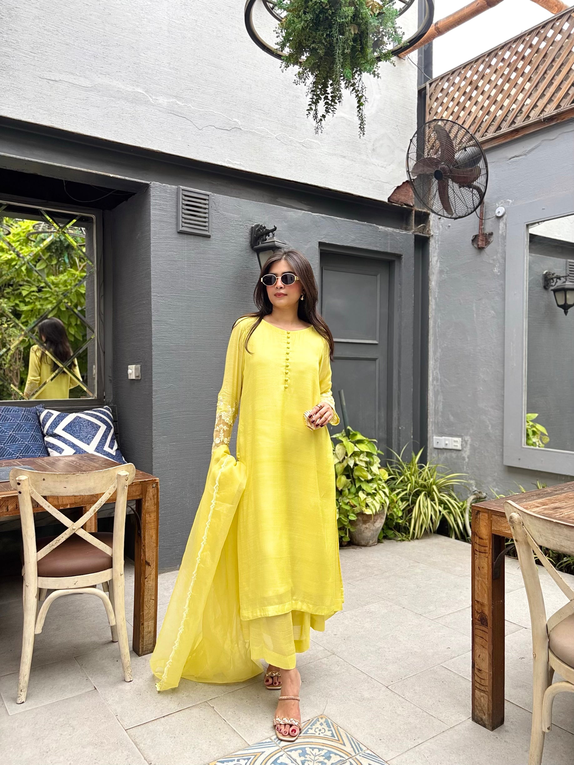 Step into the season with this Pineapple Yellow ensemble, a bright and joyful hue perfect for festive occasions and casual celebrations. Crafted from fine tussle silk, the long shirt features full sleeves, button detailing on the neckline, and delicate thread embroidery for added elegance and comfort. It comes with matching trousers and a soft organza dupatta with intricate four-side scalloping, completing a stylish and coordinated look that brings a pop of color and happiness to your wardrobe.
