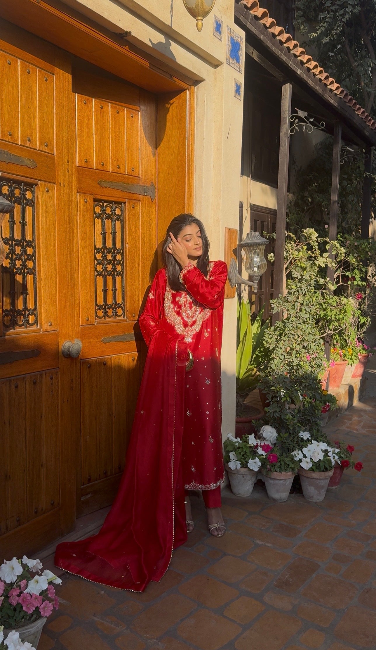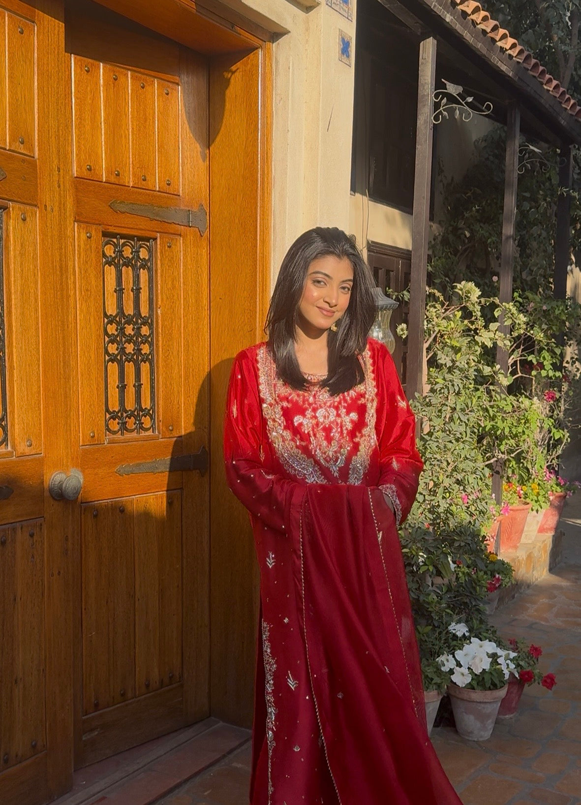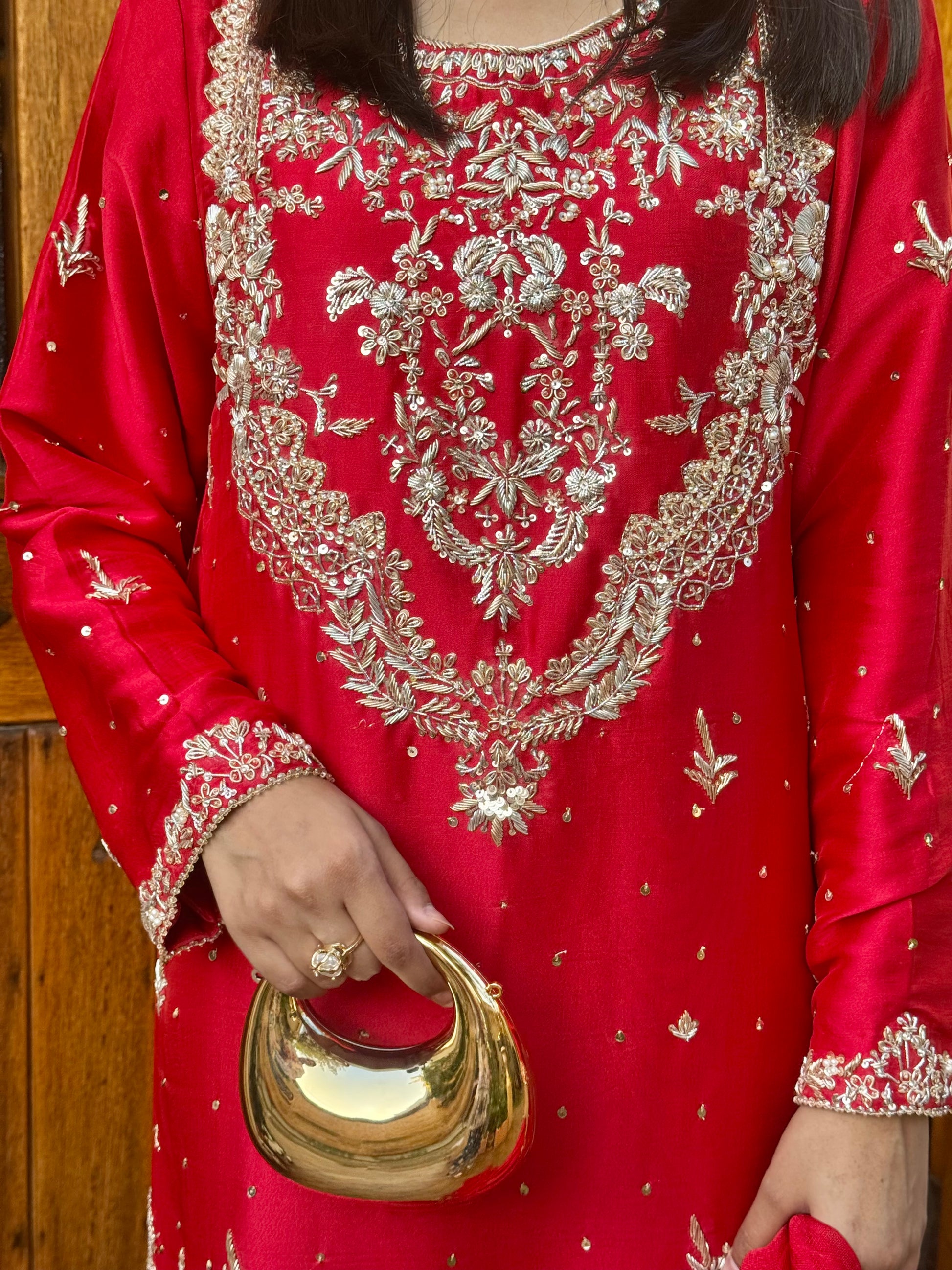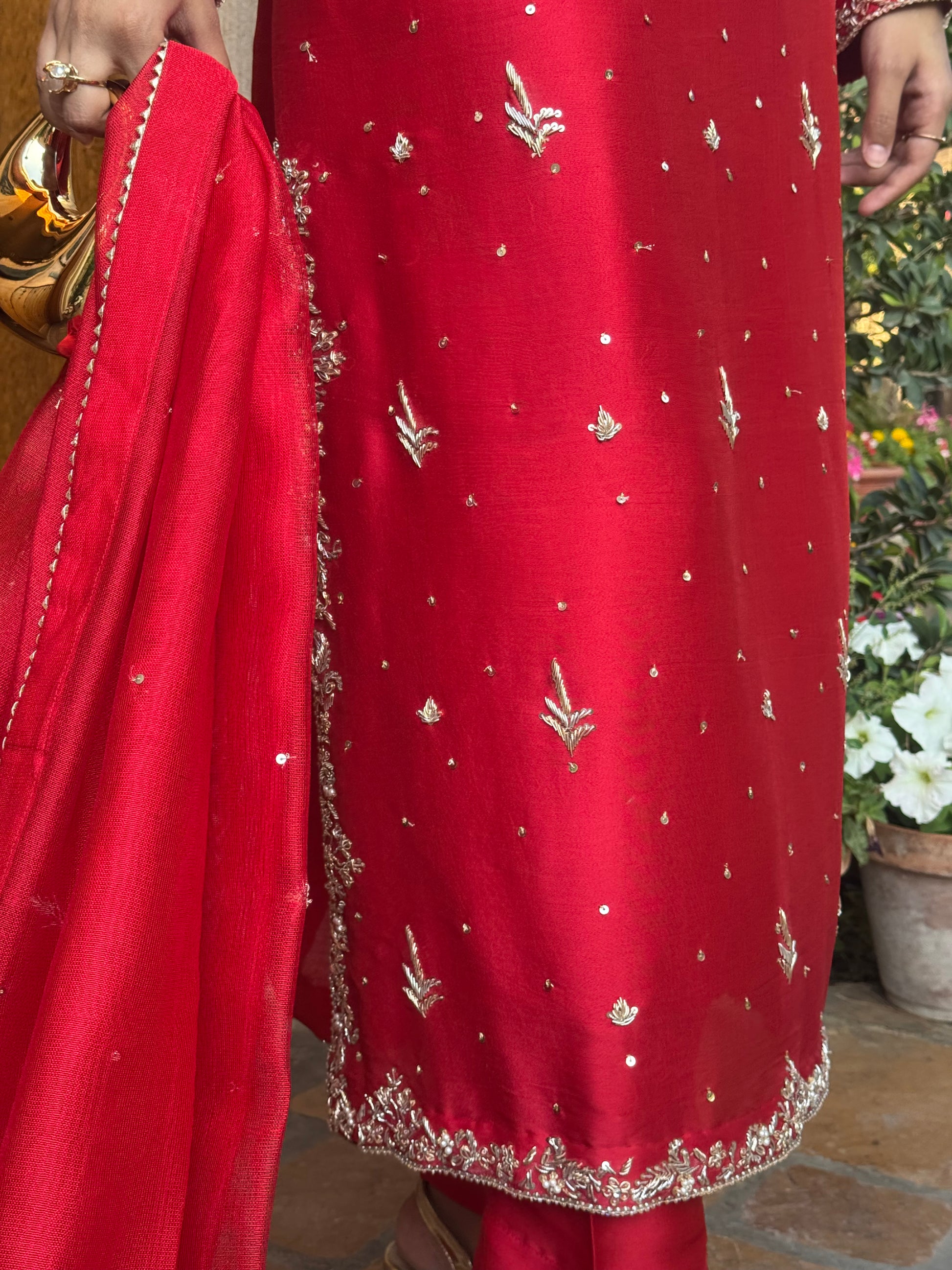 The colour of celebration in a striking red hue. Exquisite handwork on pure sheesha silk shirt and trousers, crafted with timeless finesse. Paired with a sheesha organza dupatta, adding an ethereal touch of elegance to every festive occasion.