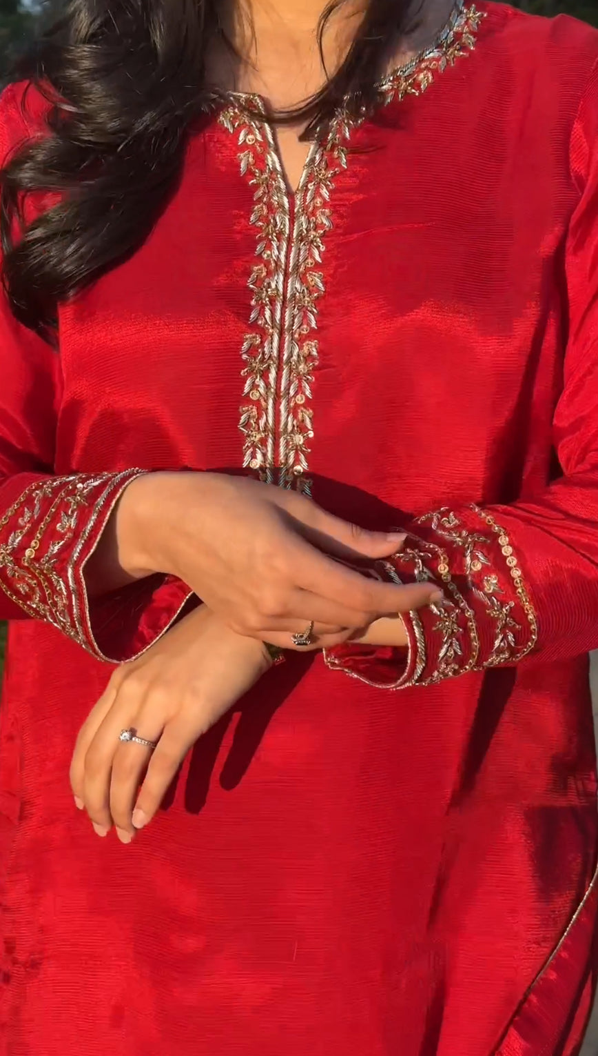Tasavvur-e-Jana – Red Maroon Seesha Silk Three-Piece Celebration Ensemble ❤️