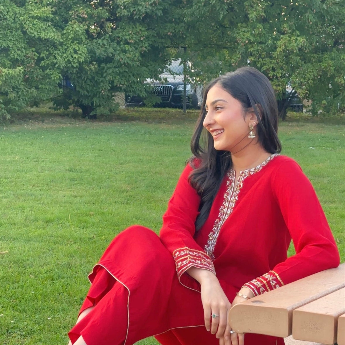 Make a statement at your celebrations with Tasavvur-e-Jana, crafted in bright red maroon seesha silk. This stunning three-piece outfit features sophisticated hand ada work on the neckline and intricate sequin detailing on the sleeves, adding elegance and charm. It comes with matching trousers and a red medium silk dupatta, completing a coordinated and luxurious look. Perfect for festive occasions, weddings, or special events, this ensemble brings a timeless touch of sophistication to your wardrobe.